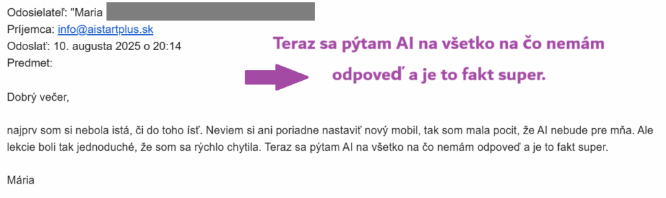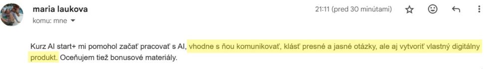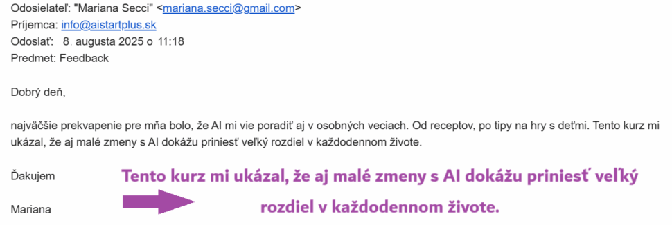 Aj keď sa vám AI môže zdať zložitá, v kurze AI ŠTART+™ uvidíte, že ju dokáže začať používať aj človek bez technických znalostí. Stačí poznať správny postup – a AI sa môže stať nástrojom, ktorý vám pomôže získať viac času, znížiť stres a priniesť do života väčší poriadok.